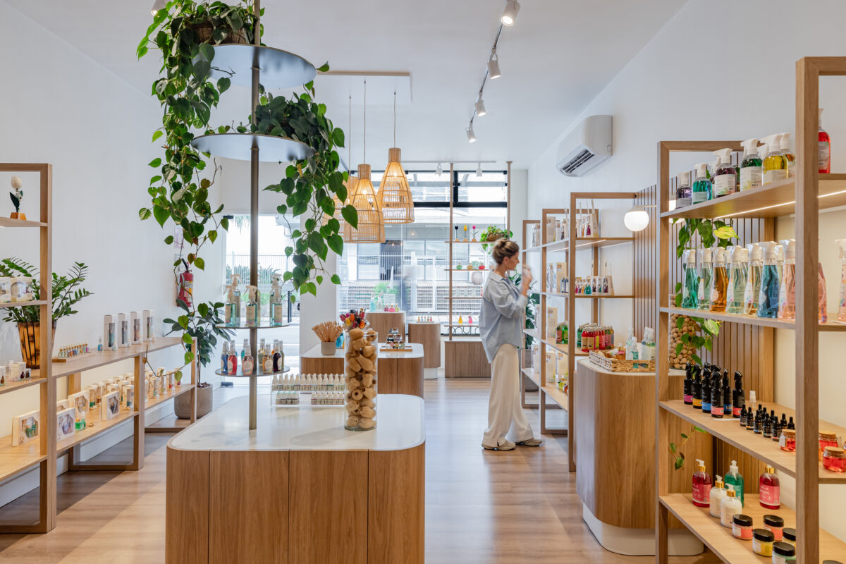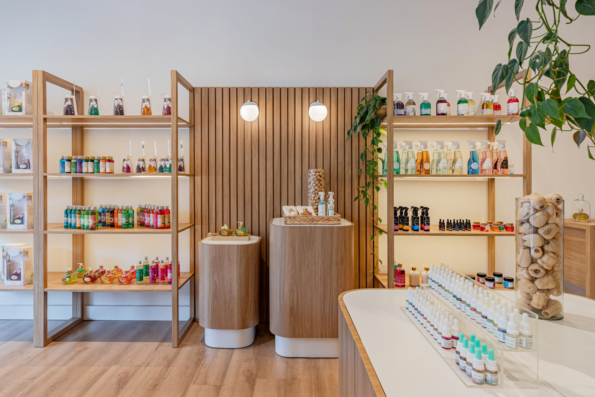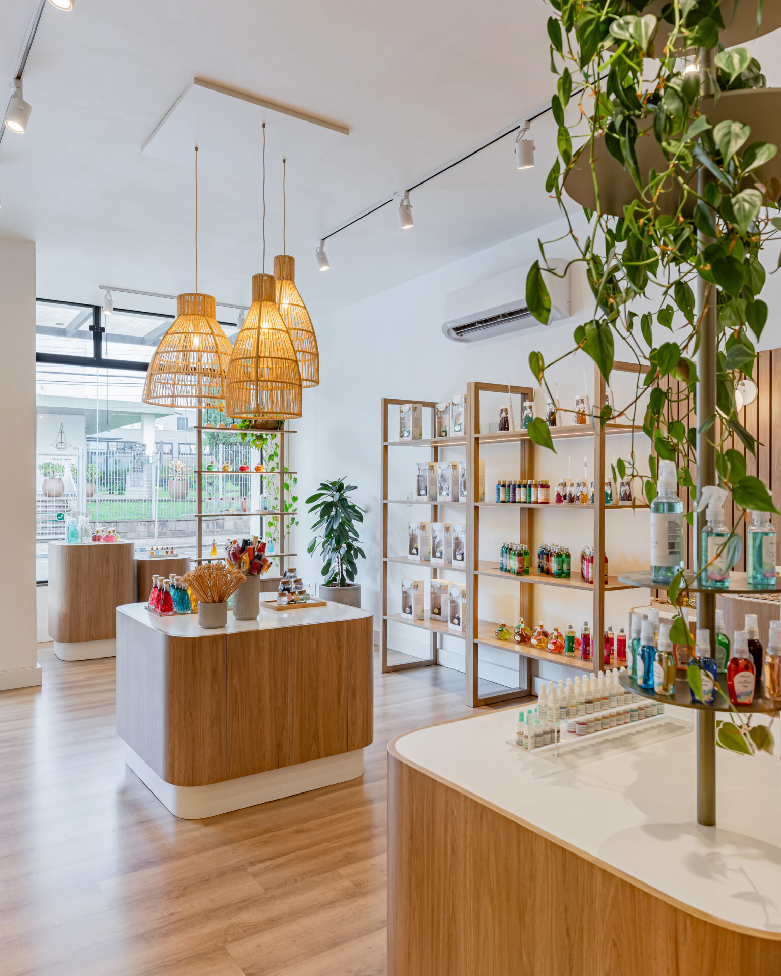 O produto, com suas cores vibrantes e essências marcantes, é o verdadeiro protagonista. A arquitetura foi pensada como cenário para potencializar essa experiência sensorial, explorando principalmente o olfato, nosso sentido mais poderoso para criar conexão emocional.
